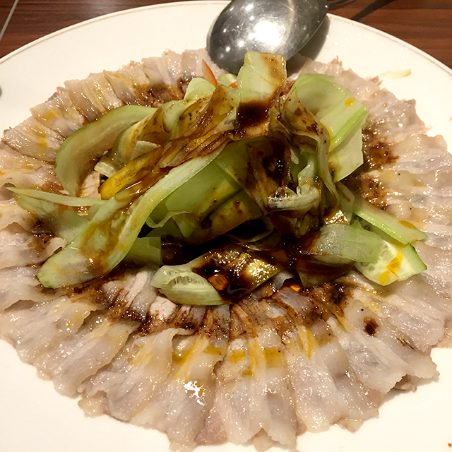 薄切りゆで豚のガーリックソース」。